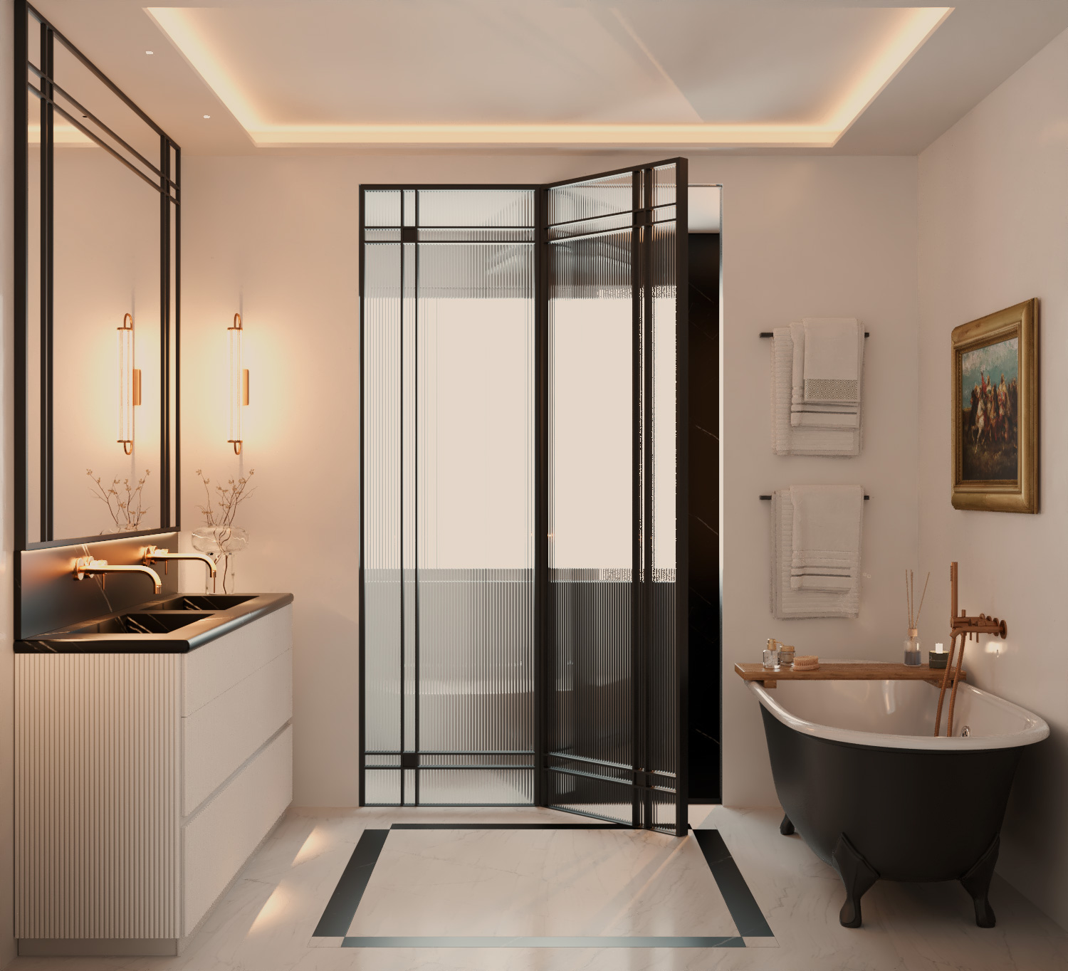 Los fresados, la palillería, los cristales acanalados en puertas diseñadas a medida, son algunos de los elementos que cuentan la historia de ésta propuesta.